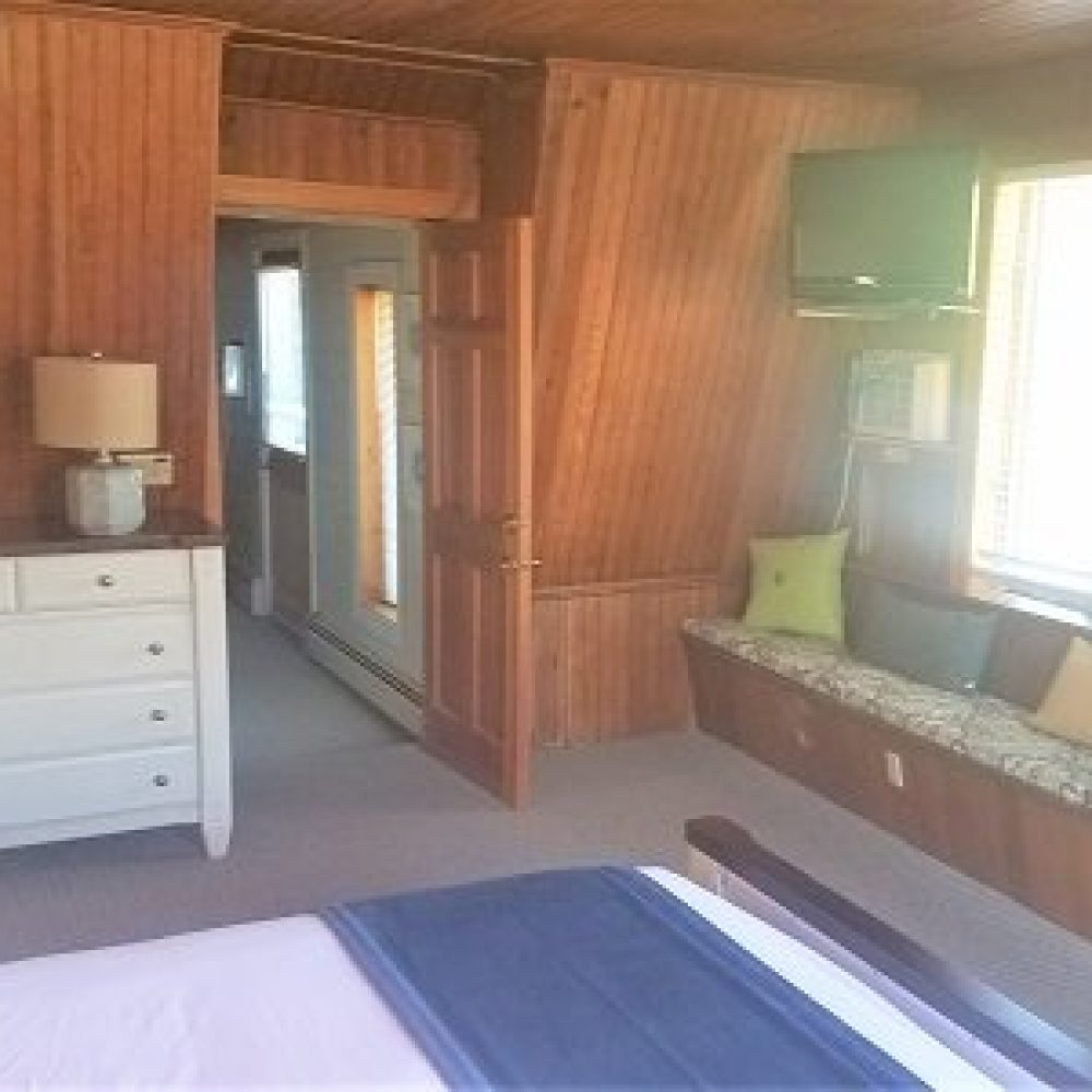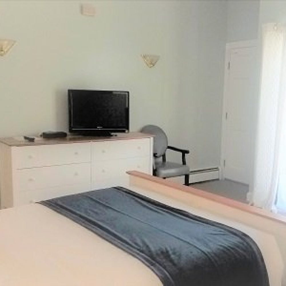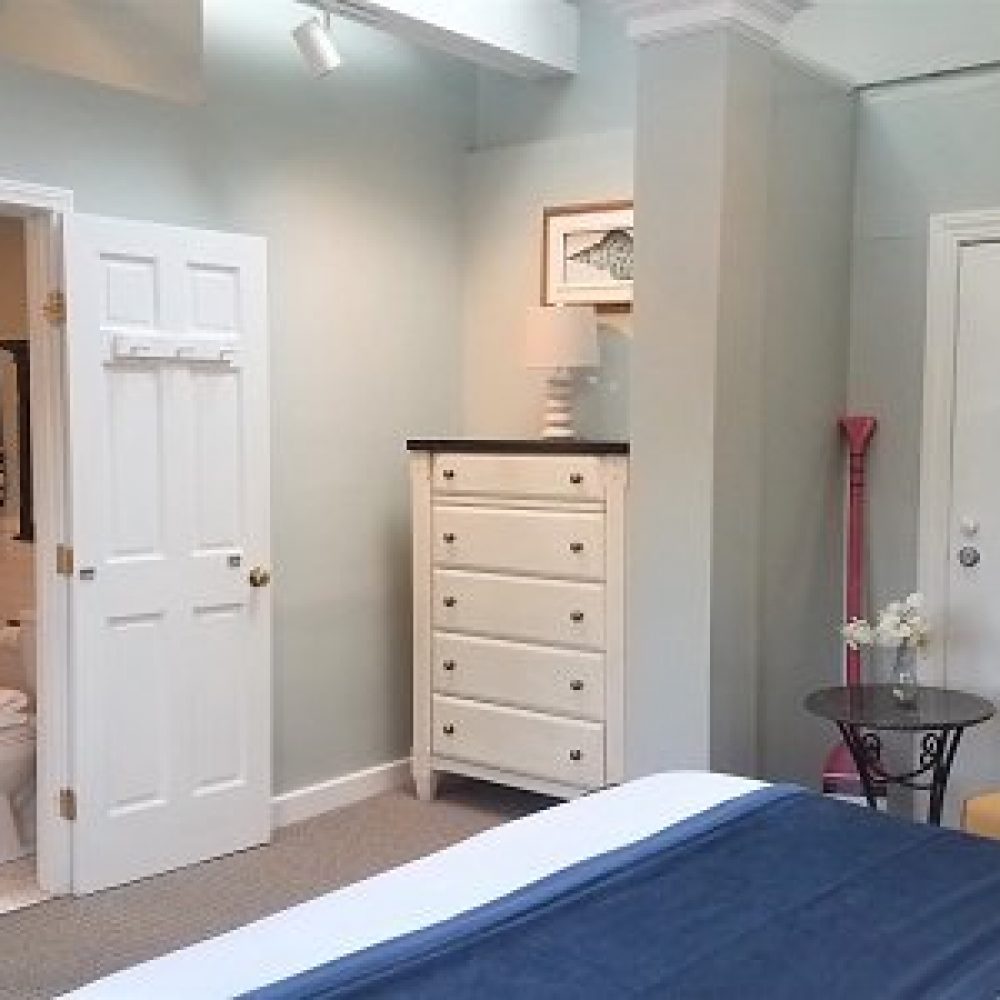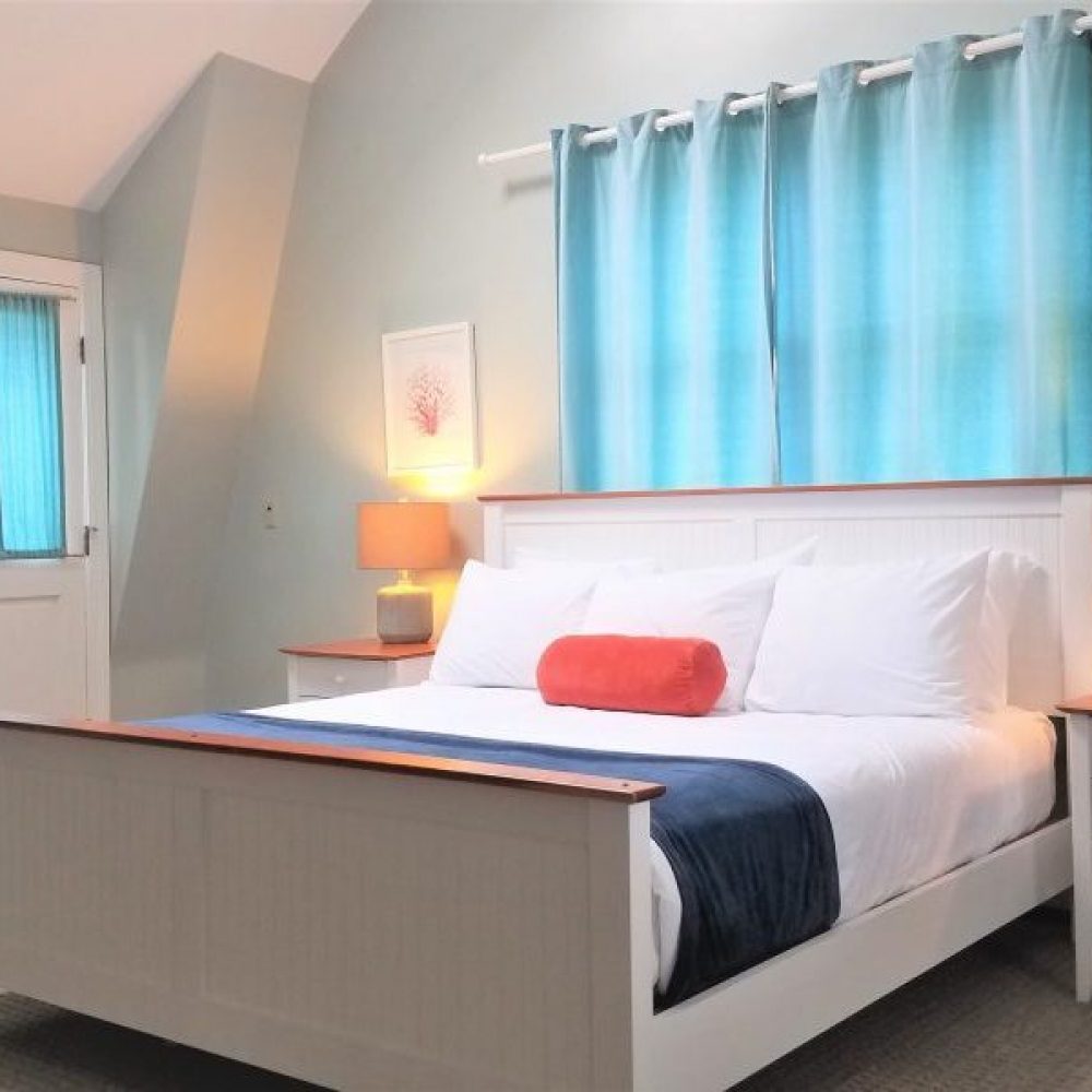 We also have the 2-room Carriage House suite. Featuring original woodwork dating back to the 1800s, the main bedroom is very spacious, with a King bed and partial ocean views. A separate sitting room offers extra space for stretching out and leads to a shared deck with peeks of the ocean across the street.
